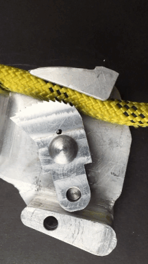 Testing showed that the Single Cam design worked best, so this was refined and exhibited at our technical review session. The central cam was waterjetted out of 6061 aluminium to create the toothed profile, the rope guides were 3D printed out of ABS, the backplate was cut from box-section aluminium, and it was all assembled with bolts. This early prototype was capable of catching a 120lb weight dropped by 1 meter.