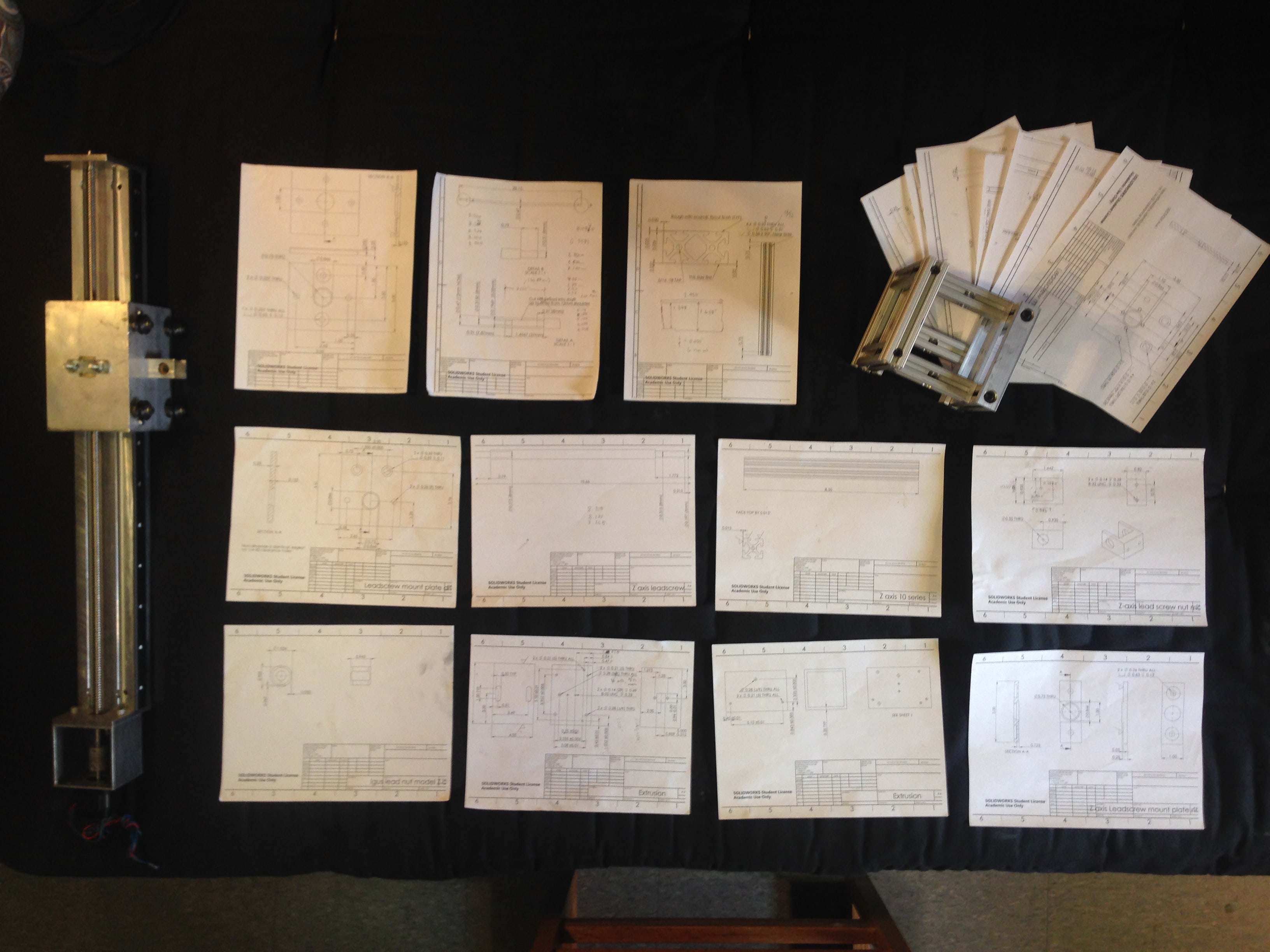 My $300 budget forced me to be resourceful in the design of my machine. I identified the components which would have to be bought in, such as the motors, power supply, leadscrews, and nuts and bolts. This left me with very little cash to play with. To keep the cost of the structure down, I relied on the abundance of T-slot aluminium extrusion on the MIT campus to make the main beams of the router. I also identified the bearings as the main source of error (and cost) for my machine, and spent a long time developing DIY bearing concepts. The slides below show the progression of these designs.