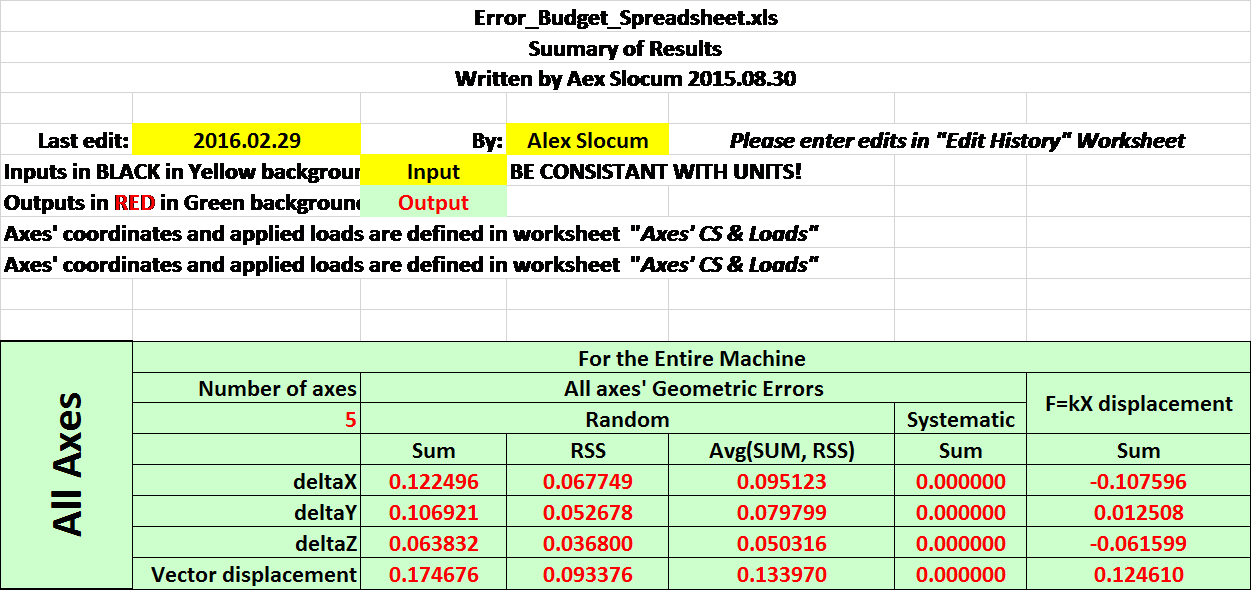 I settled on a V-and-flat arrangement with rolling wheels, then turned to my attention to the structure. I used an error budgeting spreadsheet to track the displacements and rotations due to applied forces through the structure, splitting the structure into sections and using homogeneous transformation matrices to join them all together. A cartoon representation of the structure is shown in the slide below, showing the serial elements in the structural loop. By assigning a stiffness matrix to each element in my evolving design, I could trace the effects of design changes to the stiffness of the final machine.